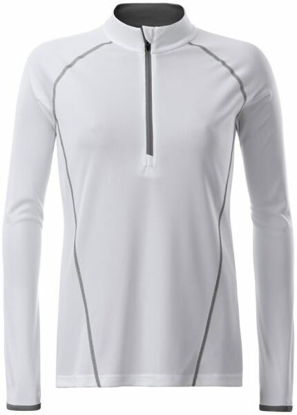 Női sportos és fitnesz hosszú ujjú funkcionális felső. Lélegző, gyorsan száradó anyagból. Cipzáras állvédelemmel.
